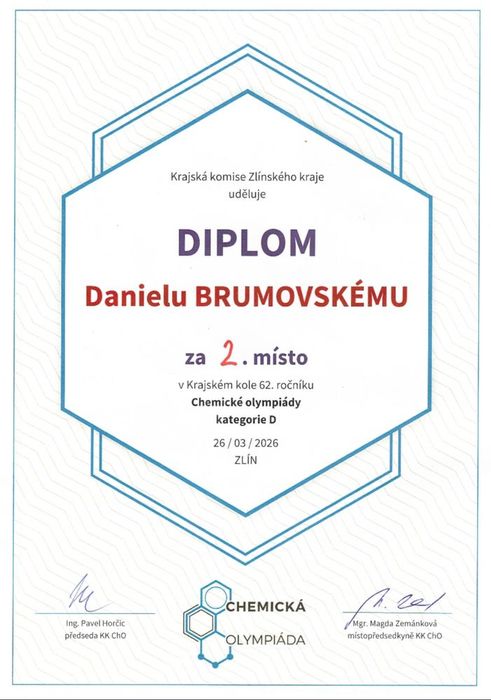 Díky stříbrné příčce v okresním kole Chemické olympiády se Dan Brumovský probojoval do kola krajského, kde potvrdil svou chemickou formu. V silné konkurenci nejlepších chemiků v kraji, včetně studentů prestižních gymnázií, se rozhodně neztratil.